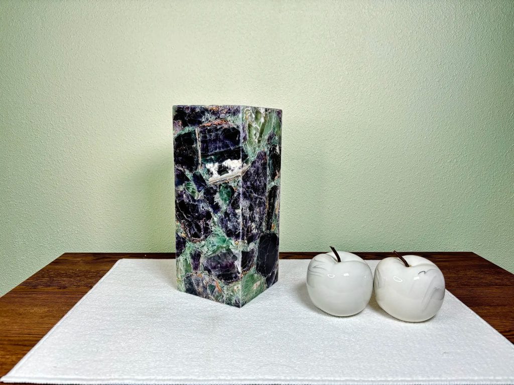 Illuminate your space with the enchanting glow of our radiant Rainbow Fluorite Table Lamp. This stunning piece is crafted from exquisite rainbow fluorite, showcasing a mesmerizing palette of greens, teals, deep blues, and purples. The lamp’s square silhouette offers a contemporary aesthetic, making it a perfect addition to any room where you want to accentuate your existing wooden furnishings. Experience the harmonious fusion of elegance and nature with this unique and beautiful table lamp.