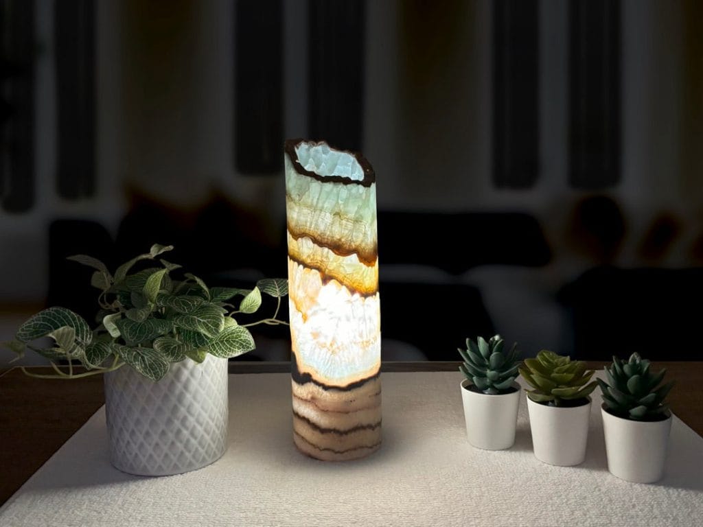 Expertly handcrafted from Oasis Onyx Marble, this book lamp highlighting its unique natural hues. The cylindrical design captures the timeless elegance of natural stone, making it a statement piece for any refined interior. Each item is unique, showcasing the artisanal craftsmanship that defines our collection. Approximate dimensions: 11.0 x 3.1 inches.