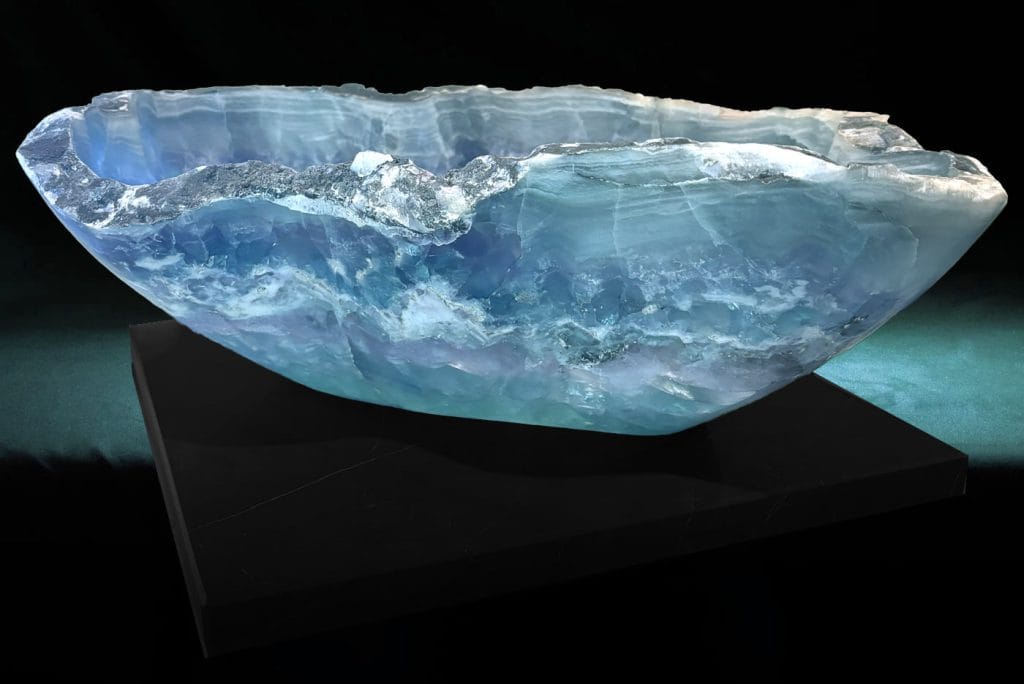 The bowl features a rustic, rough edge that adds a touch of natural charm, with contrasting black and white fluorite accents along the rim, creating a striking visual appeal. Perfect for adding a unique and sophisticated touch to any décor, this handcrafted bowl is not only a functional piece but also a beautiful work of art.