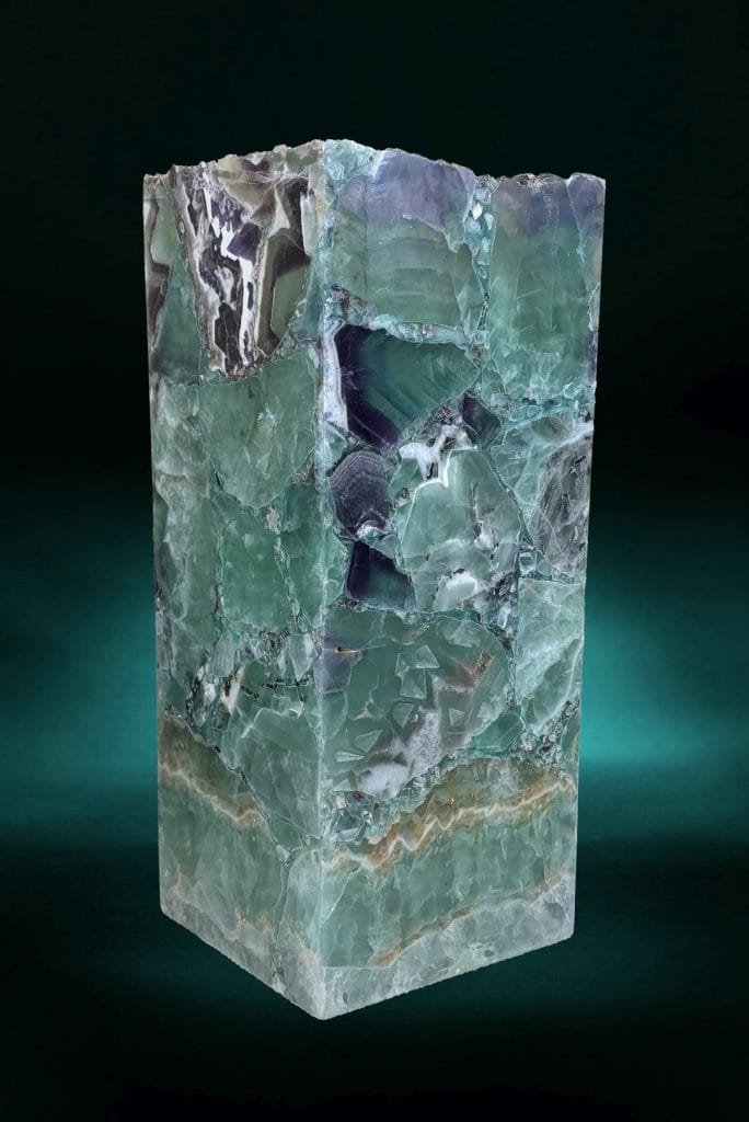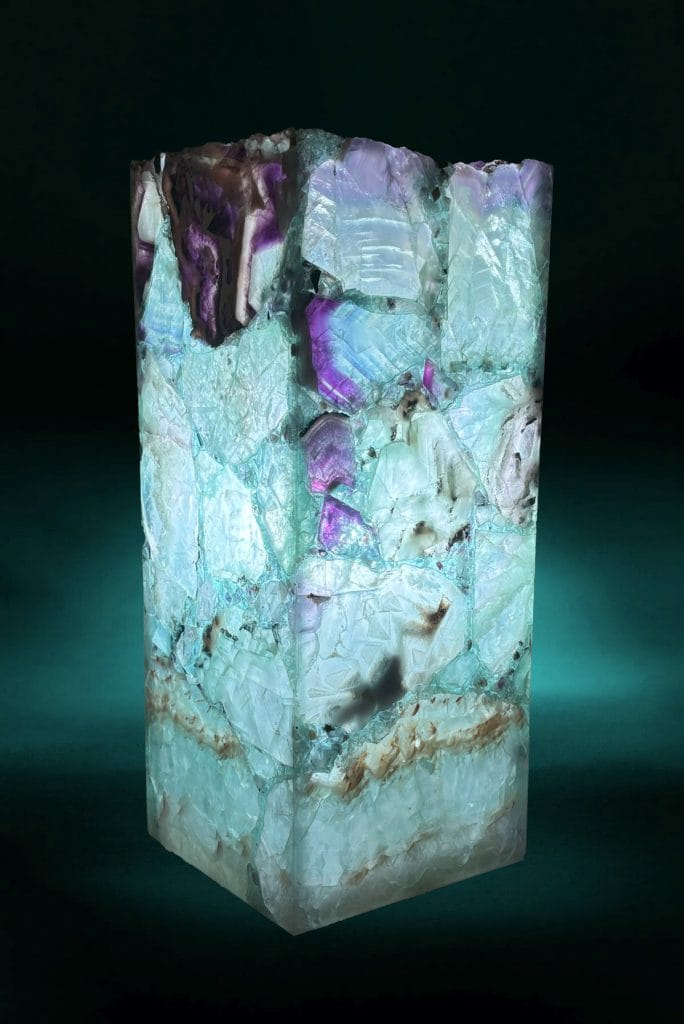 Expertly handcrafted from Rainbow Fluorite, this table lamp with stunning bands of purples, greens, and blues. The square design captures the timeless elegance of natural stone, making it a statement piece for any refined interior. Each item is unique, showcasing the artisanal craftsmanship that defines our collection.