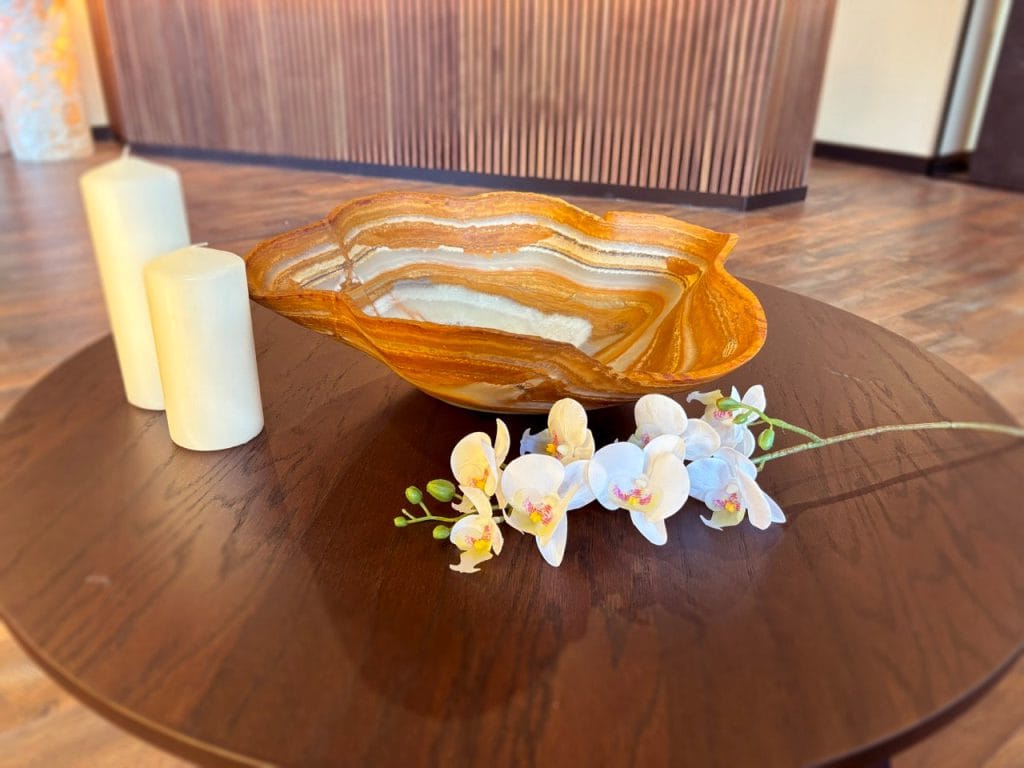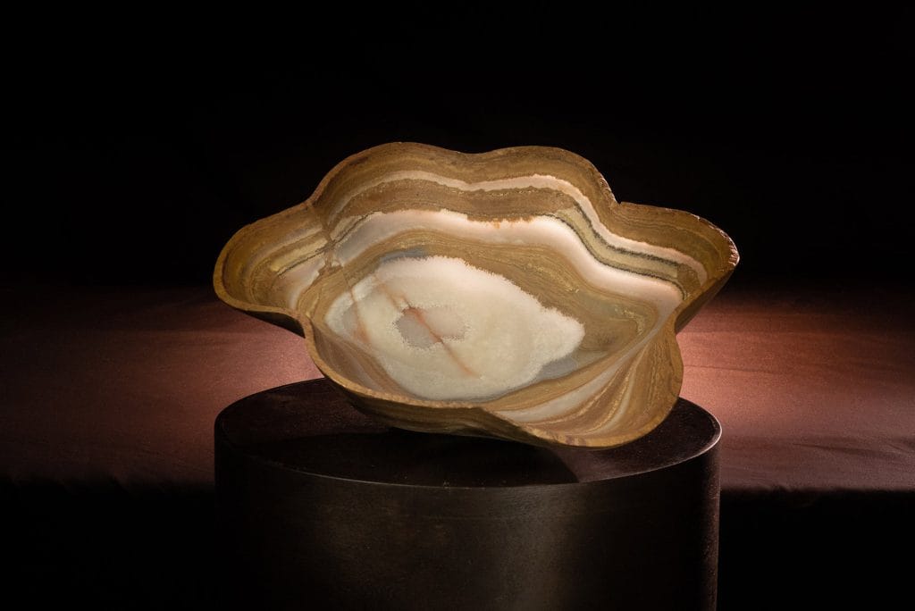 Perfect as a centerpiece or decorative accent, the Zion Calcite Onyx Bowl brings a touch of elegance and natural wonder to any space.