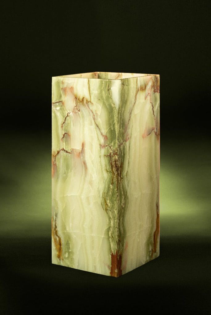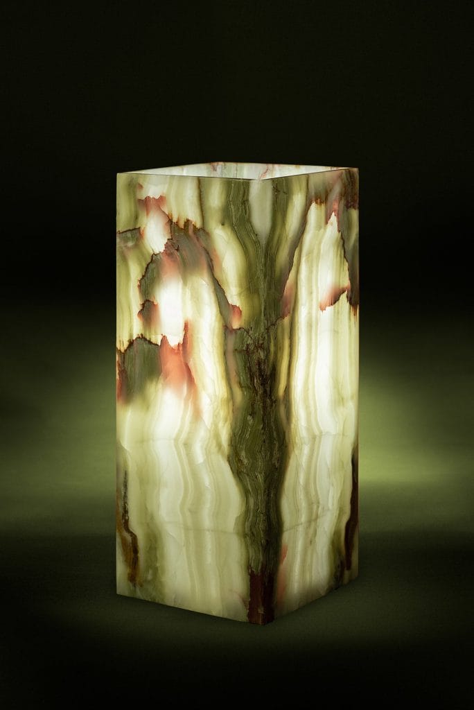 The Square Zion Table Lamp – an eye-catching piece of décor. The body of the lamp is crafted from green onyx stone with beautiful bands of reds and browns that are sure to add a breathtaking aesthetic touch to your living space. This unique lamp provides a soft, tranquilizing light that fills any room with a calming atmosphere. Perfect for achieving peace and serenity in any home or office setting. With its sophisticated look and modern design, this lamp will be sure to draw many admiring stares as soon as it’s placed.